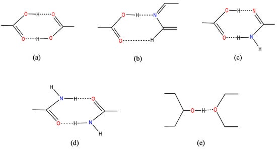 The most common supramolecular synthons in crystal engineering are (a) carboxylic acid dimer homosynthon, (b) carboxylic acid and pyridine group heterosynthon, (c) amide dimer heterosynthon, (d) amide group heterosynthons, and (e) alcohol and ether group heterosynthons.