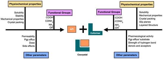 Coformers, along with drugs, have an ability to alter the pharmaceutical attributes of a cocrystal system. Thus, when designing a cocrystal, it is crucial to consider the physicochemical properties of coformers as well. The applicability of coformers to improve the stability, mechanical properties, solubility, and permeability of APIs is discussed in the current section. Figure 3 and Figure 4 depict the different aspects of API and coformers that need to be considered during cocrystal preparation.