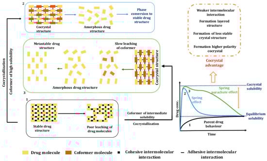 Selection of a coformer of intermediate solubility directly influences cocrystal solubility, as it will lead to a prolonged parachute effect. This hypothesis is effectively highlighted by furosemide and 2-picolinamide sesquihydrate cocrystal, as reported by Banik et al. [44]. Sustained super-saturation levels of dissolved drug were maintained over the period of 24 h. This was attributed to the fact that the coformer 2-picolinamide has intermediate solubility, which led to gradual leaching of the drug. Such a phenomenon was described by a new term, the ‘synthon-extended-spring-parachute effect’, and is depicted in Figure 7. Further, the cocrystal with higher polarity will have higher solubility and consequently higher dissolution compared to neutral ones. Surov et al. [45] reported non-ionic cocrystal of diclofenac with theophylline where only a 1.6-fold increase in solubility was observed, whereas Nugrahani et al. [46] reported zwitterionic cocrystal of the same drug with l-proline showing a 7.69-fold increase in solubility.