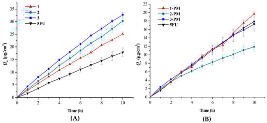 Dai et al. [78] employed Franz-type diffusion cells to study the permeability of 5-fluorouracil, its cocrystals and corresponding physical mixtures through a silicon membrane. The studied cocrystals were 5-fluorouracil (5-FU) with 3-hydroxybenzoic acid (1), 4-aminobenzoic acid (2), and cinnamic acid (3). Cumulative amounts of cocrystal permeated per unit area (Qn) and steady penetration rate (Js) were higher than those of the drug (Figure 9A). 5-FU physical mixtures with 3-hydroxybenzoic acid (1PM) and cinnamic acid (3PM) showed similar Qn while the physical mixture with 4-aminobenzoic acid (2PM) showed lesser cumulative diffusion compared to 5-FU (Figure 9B). The permeability of the 5-FU cocrystals was improved due to the replacement of the homosynthons formed between drug–drug by new drug–coformer heterosynthons. The weaker interaction between drug and coformer leads to rapid dissociation, which results in higher concentration of 5-FU cocrystals. Due to the higher concentration of 5-FU cocrystals, the flux rate increases, which leads to improved permeability.