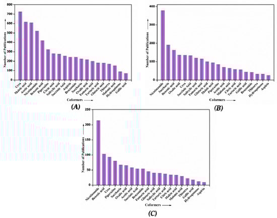 Graphical representation of coformers in high demand in the last 20 years by (A) ScienceDirect (B) Web of Science, and (C) PubMed.