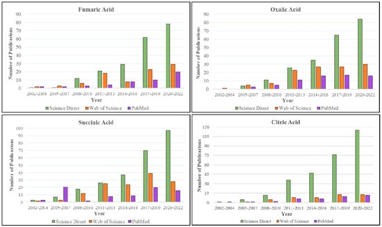 In the last two decades, the demand for coformers has upscaled, as depicted in Figure 11. Urea, nicotinamide, benzoic acid, etc., are in high demand compared to other coformers. The utility of carboxylic acid-based coformers such as succinic acid, citric acid, fumaric acid, and oxalic acid has also increased marginally. The carboxylic acid-based coformers are discussed in detail in the upcoming section of the review article.