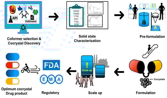 In pharmaceutical research and development portfolios, about 40% of commercialized APIs exhibit low water solubility. As stated by the biopharmaceutical classification system (BCS), drugs having low solubility and high permeability fall under class II [1]. One of the most critical challenges of BCS II drugs is to improve the solubility and dissolution rate [2]. In addition to poor aqueous solubility, most APIs exhibit undesirable physicochemical properties, flowability, compactability, etc., which hampers the solid dosage form development. The purity and performance of a drug product is severely impacted due to instabilities caused by polymorphic changes and degradation due to heat, light, and humidity during processing/storage [3,4]. Among the said problems, the poor aqueous solubility of active pharmaceutical ingredients (APIs) can be enhanced by micronization, amorphization, salt formation, cocrystallization, etc. [1]. Micronization, amorphization, and salt formation can improve the aqueous solubility of drugs, but the stability and processability are compromised in some cases [5,6]. The cocrystals approach has the potential to provide a safe way to improve solubility in addition to increasing/retaining the stability [7,8].