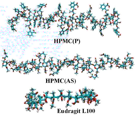 For each API, first, MD simulations were carried out to identify the potential polymeric excipients suitable for pairing. To do so, three commonly used polymeric excipients, namely, hydroxypropyl methylcellulose phthalate [HPMC(P)], hydroxypropyl methylcellulose acetate succinate [HPMC(AS)], and Eudragit L100 were chosen. Figure 1 depicts the molecular structures of drug APIs, namely, naproxen (NPX), diclofenac sodium (NaDLO), dimethyl fumarate (DMF), and omeprazole (OPZ). For each polymer, Figure 2 represents the molecular structure of a polymeric chain with 10 monomer units. Similar to our previous work [], we first constructed a repeat unit of each polymer, and then created a polymer chain with 10 monomer units using the Polymer Builder module in Materials Studio []. These polymer chains were geometrically optimized using the forcite module in Materials Studio. After optimizing the structures, input parameter files were generated for the MD simulations. The optimized potentials for liquid simulations all-atom (OPLS-AA) force field was used to describe the parameters for both APIs and polymeric structures []. Using the MKTOP tool, parameter files were created for most structures, and the TPP-MKTOP tool was used for a few structures [,]. The atomic charges were adjusted based on the OPLS-AA force field. The Lennard-Jones (LJ) and Coulombic (Coul.) potentials were used to describe the non-bonded interactions.