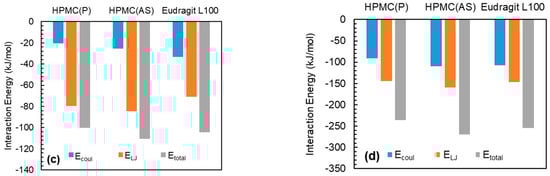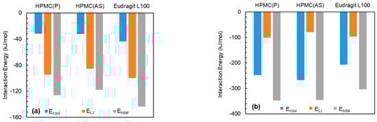The interaction energies between NPX and polymeric excipients were negative and were found to increase in the order of HPMC(AS) < HPMC(P) < Eudragit L100 (Figure 4a). This indicates that NPX exhibits favourable interactions with all polymeric excipients. Among the tested excipients, Eudragit L100 showed the highest interaction. The highest interaction between NPX and Eudragit L100 might be due to the presence of similar functional groups (-OCH3 and -COOH) in both (see Figure 1 and Figure 2). Owing to the strongest interaction of NPX, Eudragit L100 was expected to show higher solubility. It is worthwhile to note that the Etotal between NPX and polymeric excipient is dominated by van der Waals interactions (ELJ). Similarly to NPX, NaDLO–excipient interactions were negative (Figure 4b). The Ecoul, ELJ, and Etotal increased in the order of Eudragit L100 < HPMC(AS) < HPMC(P). The Etotal between NaDLO and HPMC(P) was the highest, and thus is expected to be a potential choice. The possible reason for the highest interaction between NaDLO and HPMC(P) is the favourable interaction between hexagonal aromatic rings that are present in both structures (see Figure 1 and Figure 2). Owing to the strongest interaction of NaDLO, HPMC(P) was expected to show higher solubility. Interestingly, in contrast to NPX, the Etotal between NaDLO and the polymeric excipient was dominated by electrostatic (Ecoul) interactions due to the ionic nature of NaDLO.