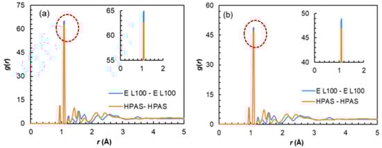 Similarly to NPX and NaDLO, DMF–excipient and OPZ–excipient interactions were negative (Figure 4c,d), indicating favorable interactions among them. For DMF, the Ecoul, ELJ, and Etotal increased in the order of Eudragit L100 < HPMC(P) < HPMC(AS), whereas for OPZ, these quantities increased in the order of HPMC(P) < Eudragit L100 < HPMC(AS). By carefully observing the chemical structures, one can say that, with a linear chain in Eudragit L100, a higher interaction with DMF (also linear chain) is expected. Interestingly, this was not observed here, instead HPMC(AS) showed the highest interaction with both DMF and OPZ. To unveil this behaviour, we further evaluated the intra-atomic Eudragit L100-Eudragit L100 and HPMC(AS)–HPMC(AS) interactions by radial distribution function g(r)as