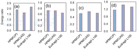The energy ratios (a) NPX–polymer/NPX–NPX, (b) NaDLO–polymer/NaDLO–NaDLO, (c) DMF–polymer/DMF–DMF, and (d) OPZ–polymer/OPZ–OPZ.