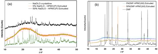PXRD pattern of (a) NaDLO–HPMC(P) extruded, (b) DMF–HPMC(AS) extruded at 5% and 50% API loading.