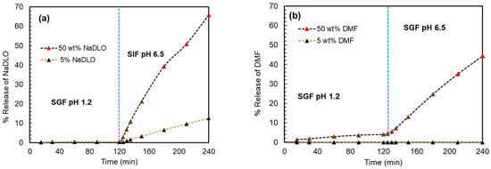 The dissolutions of the extruded samples were performed according to the protocol for enteric dosage forms. The solid dispersion of 5% w/w NaDLO with HPMC(P) showed no release in SGF pH 1.2 for 2 h. When exposed to SIF pH 6.8, HPMC(P) solid dispersion released 10% of the drug. In the case of solid dispersion containing 50% w/w NaDLO, 65–75% drug release was observed in 2 h (Figure 8a). At a pH below the pKa of the carboxylic acid group in diclofenac (around 4.0), majority of diclofenac sodium will be in the neutral form. As the pH increases above the pKa, the proportion of ionized diclofenac will increase, with a maximum at around pH 4.5 to 5.5. Above this pH range, the proportion of ionized diclofenac will decrease as the carboxylic acid group becomes fully deprotonated and the molecule becomes negatively charged []. This could be a possible explanation as to why solid dispersion of 5% w/w NaDLO with HPMC(P) showed no release in SGF pH 1.2 for 2 h. Solid dispersion of 5% w/w DMF with HPMC(AS) showed no release in both SGF pH 1.2 and SIF pH 6.8, whereas solid dispersion containing 50% DMF started releasing DMF in SGF pH 1.2 (5% in 2 h) and in SIF pH 6.8, incomplete release (42% in 2 h) was observed (Figure 8b). Although both polymers are soluble in SIF pH 6.8, the negligible dissolution of the drug at 5% w/w loading could be due to a strong interaction between the APIs and the polymer.