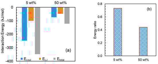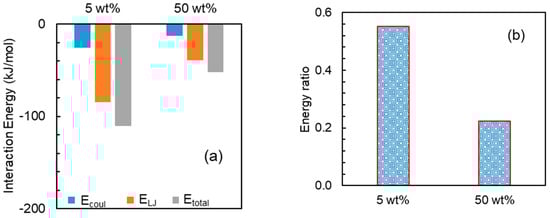 (a) Interaction energies between NaDLO and HPMC(P) and (b) energy ratio: NaDLO– HPMC(P)/NaDLO–NaDLO at 5 and 50 wt% NaDLO.