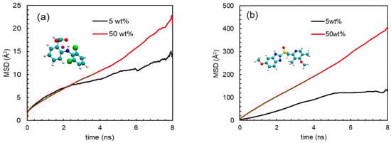 where N is the number of active molecules and ri(t) is the position of the ith active molecule at time t. To be precise, MSD was computed based on the trajectory from 2 ns to 10 ns. Figure 11 depicts the MSDs of NaDLO and DMF in HPMC(P) and HPMC(AS), respectively, at 5 and 50 wt% loadings. As simulation time proceeds, the MSDs continuously increase. As the loading of NaDLO increases from 5 to 50 wt%, the mobility of the NaDLO is enhanced, as indicated by the increased MSD value at 50 wt% (Figure 11a), which, in turn, indicates faster release of NaDLO from solid dispersion. This supports the experimental observation obtained from the release study (Figure 8a). Similar to the MSD of NaDLO in HPMC(P), the MSD of DMF in HPMC(AS) also depicts that, with an increase in loading, the mobility of the DMF is raised (Figure 11b). This is also consistent with experimental observation (Figure 8b). Overall, upon increasing the loading of API, API–polymer interaction decreases, which results in higher mobility of APIs in solid dispersions, thus boosting the release of APIs in the SIF environment.