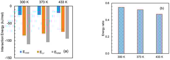 (a) Interaction energies between DMF and HPMC(AS), and (b) energy ratio: DMF–HPMC(AS)/DMF–DMF at temperatures of 300, 373, and 433 K.