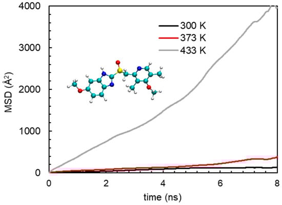 The release phenomena of an API from solid dispersion could efficiently be illustrated by dynamics of the API in solid dispersion. Usually, the dynamics of a molecule in a mixture environment is evaluated by mean-squared displacement (MSD) [,]. Not only the dynamics, but also the diffusion modes of a molecule/particle can be characterized by MSD []. The MSD is quantified as