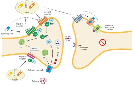 Opioid mechanism of action. Opioids bind to their μ, κ, and δ receptors at presynaptic level, carrying out different actions. After the interaction with a receptor, the α subunit of protein G inhibits the pathway of AC, resulting in a reduction in calcium channel activity and then the release of glutamate. The same channel is inhibited via the βγ subunit. Buprenorphine is a particular drug since it has partial agonist activity on μ receptor and antagonist activity on κ receptors. Opioids also exert stimulating activity on calcium and chloride channels, resulting in hyperpolarization at postsynaptic level. AC, adenylate cyclase; cAMP, cyclic adenosine monophosphate; GDP, guanosine diphosphate; Glu, glutamate; GTP, Guanosine-5′-triphosphate; PKA, protein kinase A.