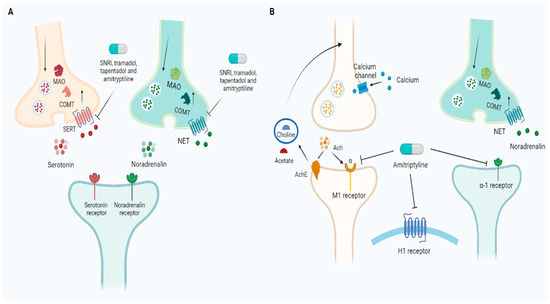 Antidepressants used for pain management. (A) Amitriptyline and SNRIs inhibit SERT and NET, blocking serotonin and noradrenaline reuptake and increasing the availability of the two neurotransmitters in synaptic cleft. The same action is shared by two opioids, non-antidepressant drugs, namely, tramadol and tapentadol. (B) Nevertheless, amitriptyline is associated with several side effects according to its inhibitory action on cholinergic, adrenergic, and histaminergic pathways. Ach, acetylcholine; AchE, acetylcholinesterase; COMT, catechol-O-methyltransferase; MAO, monoamine oxidase; NET, norepinephrine transporter; SERT, serotonin transporter; SNRI, serotonin and norepinephrine reuptake inhibitors.