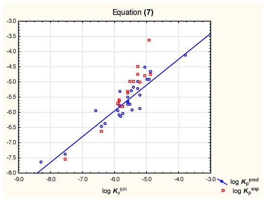 Equation (7)—predicted and experimental log Kp vs. reference values.
