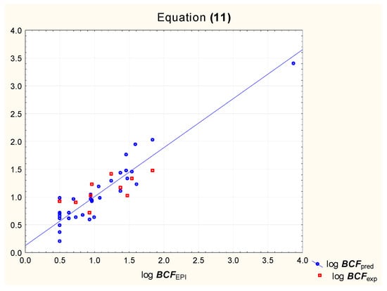Equation (11)—predicted and experimental log BCF vs. reference values.