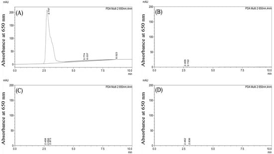 Representative HPLC chromatograms acquired based on absorbance at 650 nm for: (A) free CF647 dye at 20 nmol/mL concentration, (B) blank serum extracts, (C) serum extracts obtained from rats 4 h post injection of PLGA-PEG/F127 at a 150 mg/kg dosage, and (D) serum extracts obtained from rats 4 h post injection of PLGA-PEG/P80 at a 150 mg/kg dosage.