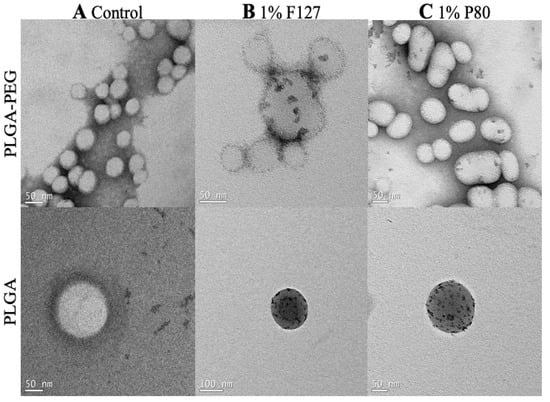 TEM images of PLGA-PEG and PLGA polymers with 1% F127 and 1% P80 surfactant solutions. (A) Controls are nanoparticles fabricated without surfactant solutions, (B) nanoparticles in 1% F127 solution, and (C) nanoparticles in 1% P80 solution. Scale bars: 50 nm and 100 nm.