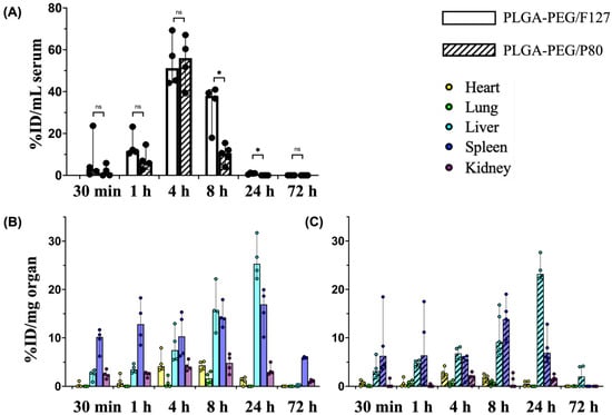 Biodistribution of PLGA-PEG/F127 and PLGA-PEG/P80 versus post-injection time (30 min, 1 h, 4 h, 8 h, 24 h, and 72 h) in P10 rats. (A) Serum and (B,C) organs (heart, lung, liver, spleen, and kidney) after i.p. injection (n = 4 per timepoint), %ID: percentage of injected dose. Graphs display median ± 95% confidence interval. Group differences were evaluated using Welch’s t-test; ns: not significant; *: p < 0.05.