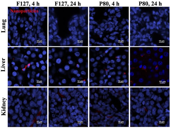 Tissue-level biodistribution of PLGA-PEG/F127 (F127) and PLGA-PEG/P80 (P80) nanoparticles (red) in P10 rat lung (first row); liver (second row); kidney (third row) at 4 h (first and third column) and 24 h (second and fourth column) after administration. Blue: DAPI nuclei stain. Scale bars: 10 m.
