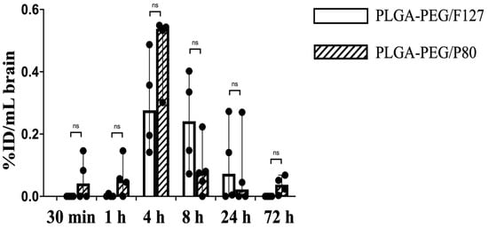 Biodistribution of PLGA-PEG/F127 and PLGA-PEG/P80 versus post injection time (30 min, 1 h, 4 h, 8 h, 24 h, and 72 h) in P10 rat brain after i.p. injection (n = 4 per timepoint). Graph displays median ± 95% confidence interval. Group differences were evaluated using Welch’s t-test; ns: not significant.
