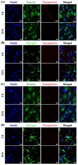 Localizations of PLGA-PEG/F127 and PLGA-PEG/P80 nanoparticles (red) in the cortex of healthy P10 rat brain at 4 h and 24 h after administration. (A) PLGA-PEG/F127 in cortical neurons, (B) PLGA-PEG/F127 in cortical microglia, (C) PLGA-PEG/P80 in cortical neurons, and (D) PLGA-PEG/P80 in cortical microglia. Blue: DAPI nuclei stain. Scale bars: 10 m.