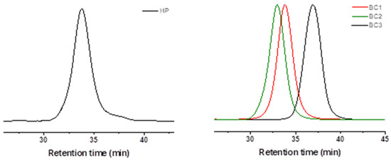 The conversion was calculated using 1H NMR spectra from the integral intensities of respective monomer and polymer signals. The final (co)polymers were purified by dialysis against acetone using a molecular weight cut-off (MWCO) of 2 kDa. The (co)polymers were recovered by evaporation of the solvent, dried under vacuum for about 24 h, and then analyzed by 1H NMR spectroscopy and SEC analysis. The 1H NMR spectra are shown in Figure S1a in Supplementary Materials, SEC chromatograms are presented in Figure 2, and results are summarized in Table 1. The subscripts of the homopolymers and copolymers refer to the weight average molecular weights of each block as determined by 1H NMR.