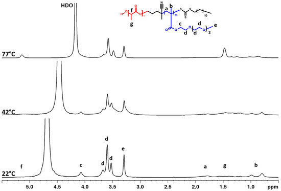 1H NMR spectra of PLA-b-PTEGMA (BC2) NPs in D2O solution (c = 2.8 mg·mL−1) measured at 22, 42, and 77 °C under the same instrumental conditions.