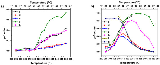 Temperature dependencies of the p- fraction as determined for signals of various proton types in aqueous solutions (c = 2.5 mg·mL−1) of HP (a) and BC2 (b) during gradual heating.