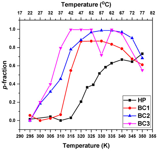 Temperature dependencies of the p-fraction for the PTEGMA CH2 protons (signal “a”) in D2O solutions (c = 2.5 mg·mL−1) of HP and BC1-BC3 copolymers determined during gradual heating.
