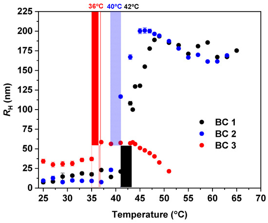 Hydrodynamic radius (RH) of the block copolymer NPs (BC1, BC2, and BC3) in water (c = 2.5 mg·mL−1) measured as a function of temperature.