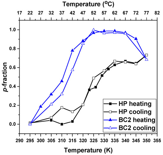 Temperature dependencies of the p- fraction for the PTEGMA CH2 protons (signal “a”) in D2O solutions (c = 2.5 mg·mL−1) of HP and BC2 NPs determined during gradual heating and subsequent gradual cooling.