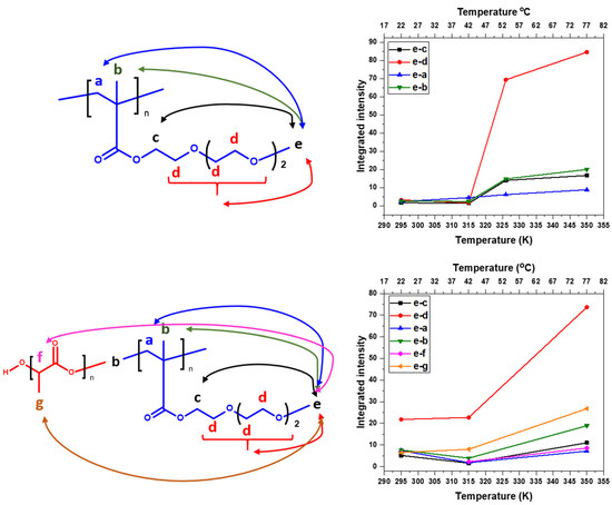 Chemical structures and intermolecular correlations in HP (upper left) and BC2 (lower left). Temperature dependencies of integrated intensities of various signals in 1D slices extracted from the signal of “e” protons of PTEGMA units of the 2D NOESY of D2O solutions (c = 2.5 mg·mL−1) of the HP (upper right) and BC2 (lower right).