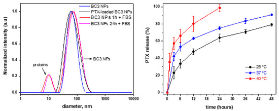 Size distributions obtained by DLS for PTX-unloaded BC3 NPs (blue lines), PTX-loaded BC3 NPs (black lines), and in the presence of 10% FBS after 1 h (red lines) and 24 h (magenta lines) (left), in addition to drug release profiles from PTX-loaded BC3 at 25 (black lines), 37 (blue lines), and 40 °C (red lines) (right).