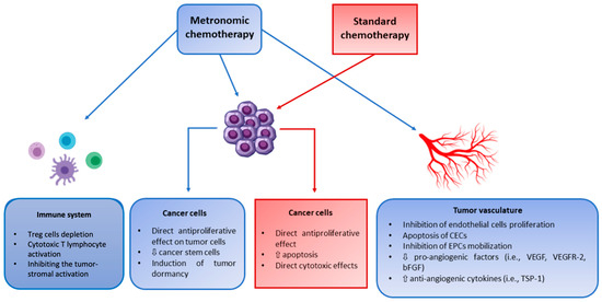 Mechanism of action of metronomic chemotherapy versus standard chemotherapy. bFGF; basic fibroblast growth factor, CEC; circulating endothelial cell, EPC; endothelial progenitor cell, TSP-1; thrombospondin-1, Treg; regulatory T cells, VEGF; vascular endothelial growth factor. Reproduced with slight modification and permission from [32].