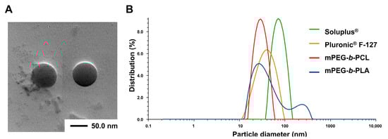 (A) Transmission electron microscopy (TEM) image of PTX/SRF-encapsulated mPEG-b-PCL micelles. (B) Representative particle size distributions of PTX/SRF-encapsulated micelles prepared with various polymers (PTX:SRF:polymer =3:3:100, weigh ratio, n = 3).