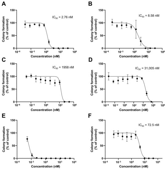 - Franken, N.A.P.; Rodermond, H.M.; Stap, J.; Haveman, J.; van Bree, C. Clonogenic assay of cells in vitro. Nat. Protoc. 2006, 1, 2315–2319. [Google Scholar] [CrossRef]