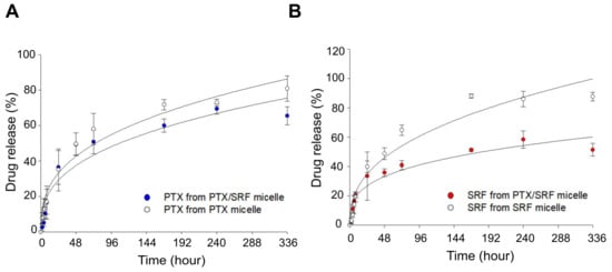 In the release profile, the PTX/SRF micelle combination released the drug at a slower rate than for individual micelles. As shown in Figure 6, PTX/SRF micelles and PTX micelles released 50.9% and 58.1% of PTX at 72 h, and 65.6% and 80.9% of PTX at 336 h, respectively. Further, SRF from PTX/SRF micelles and SRF micelles released 40.9% and 64.9% at 72 h, and 51.4% and 87.7% of SRF at 336 h, respectively.