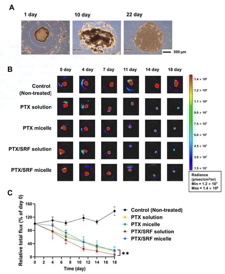 Tumor spheroids were observed microscopically on days 1, 10, and 22 after preparation (Figure 7A). After 24 h of tumor spheroid preparation, cell aggregation was observed inside the hemispherical matrigel. Tumor spheres were then detached from the bottom of the ULA plate, and the cells were aggregated and grown on matrigel cores. After 22 days, it was found to be three-dimensionally close to a sphere. Compared with day 0, the total relative luminescence intensity during the entire experimental period increased in the control group but decreased in the drug-treated group (Figure 7B). Compared to the control group, the average total flux value decreased by 85.5%, 84.9%, 94.7%, and 85.9% in the order of PTX solution, PTX micelles, PTX/SRF solution, and PTX/SRF micelles, respectively (Figure 7C). At the end of the experiment, there was a significant difference in the relative total flux between the PTX solution and PTX micelles (** p < 0.01), and between the PTX/SRF solution and PTX/SRF micelles (** p < 0.01).