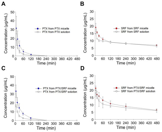 Plasma concentration–time profiles of PTX and SRF after IV injection in SD female rats, (A) PTX from PTX solution and PTX micelle, (B) SRF from SRF solution and SRF micelle, (C) PTX from PTX/SRF solution and PTX/SRF micelle, (D) SRF from PTX/SRF solution and PTX/SRF micelle (n = 3).