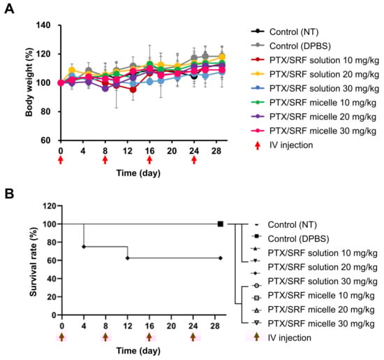 Toxicity evaluation was performed after a stabilization period in a laboratory environment for at least 1 week after receiving 5-week-old ICR female mice. A formulation is considered toxic when >20% weight loss, abnormal behavior, discomfort, or death occur [56,57]. The control group was a non-treated group. The administration group was divided into a drug administration group and a DPBS administration group. Toxicity of formulation was assessed by concentration (10, 20, and 30 mg/kg) in an injected mouse tail vein. A solution was prepared by dissolving PTX and SRF using a solubilizer in the following volume ratio (EtOH: Cremophor EL®: sterile distilled water = 1:1:1, v/v/v). The micelles were prepared by hydration with sterile distilled water immediately before production using the freeze-drying method. Before administration, the exact concentration of the formulation was obtained using HPLC, and the injection volume was calculated to reflect the weight of each mouse and injected. The body weight of mice was measured on days 0 (first administration day), 2, 5, 8, 10, 13, 16, 18, 21, 24, 26, and 29, and the drug was injected every 8 days.