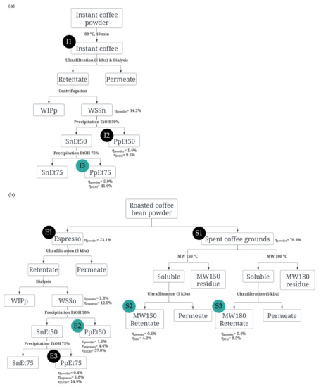 Polysaccharide purification process scheme from (a) Instant coffee; (b) Espresso coffee and spent coffee grounds.