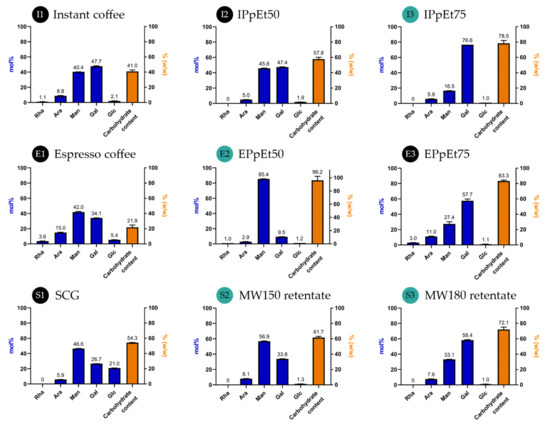 Carbohydrate content and composition of chosen fractions. E1, E2, and E3 correspond to fractions from espresso coffee; I1, I2, and I3 correspond to fractions from instant coffee, and S1, S2, and S3 correspond to fractions from SCG. Codes names are referenced in Figure 1.