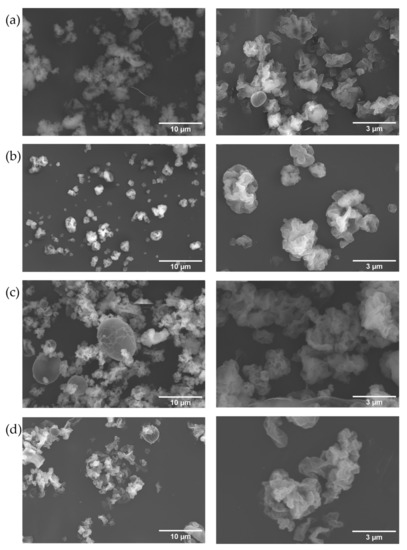 SEM micrographs of particles made with: (a) IPpEt75; (b) EPpEt50; (c) MW150 retentate; and (d) MW180 retentate. Images on the left have an ampliation of 3 k and on the right 10 k. Images on the left and on the right were collected with a 3000- and 10,000-times magnification, respectively.