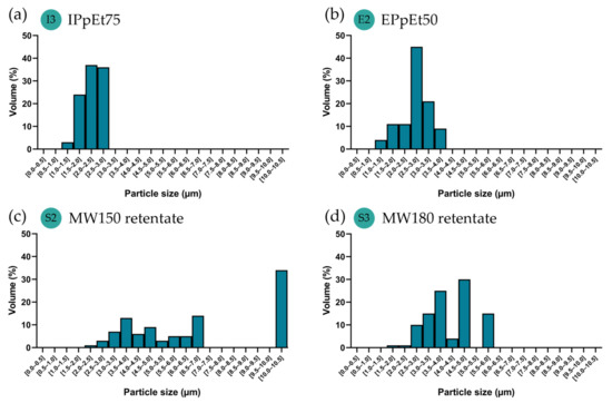 Particles volume distribution histograms based on the 2D particle size quantified in the SEM micrographs, correspondently made with (a) IPpEt75, (b) EPpEt50; (c) MW150 retentate, and (d) MW180 retentate. Images were treated using the ImageJ software (ImageJ 1.53k).