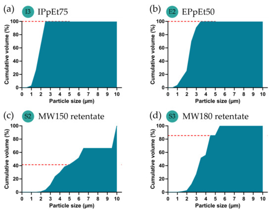 Cumulative volume determined based on the particle size for microparticles made with (a) IPpEt75, (b) EPpEt50; (c) MW150 retentate; and (d) MW180 retentate.