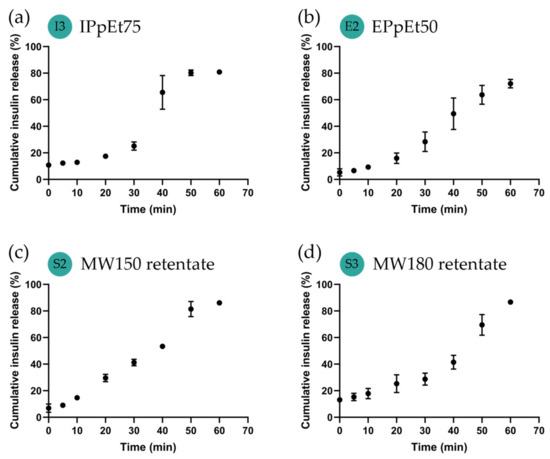 The rate of drug release from the carriers must be carefully analysed in new formulations because different release kinetics dictate the corresponding outcome of the drug. Figure 5 shows that insulin was totally released in a time-dependent manner for all the samples. This means that to reach 0.35 mg of insulin, the average amount required by a patient per meal [48], 3–4 mg of powder of the proposed formulation would be necessary to reach the range of therapeutic dosage. The profile of release differed from sample to sample. For the IPpEt75-based microparticles, the release presented a sharp sigmoidal profile, with a burst release between 30 and 40 min, reaching 81% of insulin at 1 h (Figure 6a). From the EPpEt50-based microparticles, insulin was released gradually, reaching about 72% of the total release at 1 h (Figure 6b). Regarding the microparticles assembled with extracts of the SCG, MW150 retentate-based microparticles were released in a linear manner (R2 = 0.9620) throughout the time analysed for up to 86% of the insulin content (Figure 6c). From the MW180 retentate-based microparticles, the release profile resembled a smooth sigmoid, with a very slow release in the first 30 min and a gradual release in the following 30 min, which also reached about 86% of the insulin content (Figure 6d).