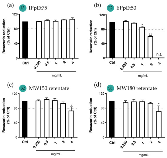 Effect of microparticle exposure for 24 h on cellular viability of human alveolar epithelial cells (A549 cell line) using microparticles made from (a) IPpEt75; (b) EPpEt50; (c) MW150 retentate; and (d) MW180 retentate. n.t.—not tested. Data correspond to the mean ± SEM of at least three independent experiments performed in duplicate and are represented as a % of untreated cells (Ctrl). Statistical analysis: one-way ANOVA with Dunnett’s multiple comparison test; Significance levels are as follows: * p < 0.01, and ** p < 0.001 compared to Ctrl.