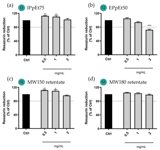 Considering the toxicity results shown in A549 cells (Figure 7), cell viability on macrophages (Figure 8) was evaluated only at concentrations equal to or below 2 mg/mL. In Raw 264.7 cells, IPpEt75-based microparticles showed no reduction in cell viability as observed for A549 cells (Figure 8a). EPpEt50-based microparticles decreased cell viability to 72% and therefore were considered cytotoxic from this concentration upwards. The microparticles made from either MW150 (Figure 8c) or MW180 retentate (Figure 8d) showed no reduction in cell viability for all the concentrations tested, thus allowing them to be declared non-cytotoxic.